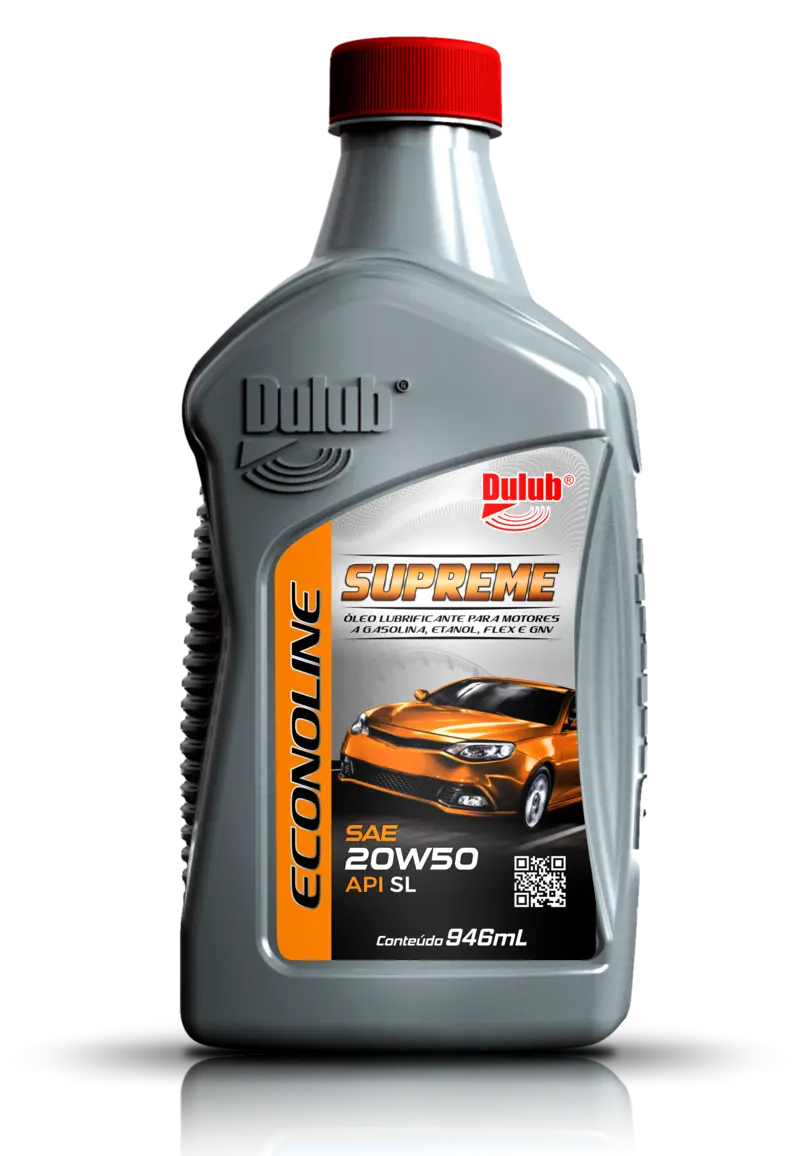 Óleo lubrificante mineral multiviscoso de última geração utilizado em modernos motores de automóveis atuais. Garante uma perfeita lubrificação do motor, tanto nas partidas a frio quanto nas temperaturas de funcionamento do veículo. O Dulub Supreme atende ao nível de desempenho API SL e é indicado para todos os motores a gasolina, etanol ou GNV de todas as marcas e potências. ECONOLINE SUPREME 20W50 controla a formação borras e depósitos, mesmo a altas temperaturas, reduzindo os desgastes e a corrosão nas partes lubrificadas. ECONOLINE SUPREME 20W50 possui elevada resistência a oxidação e aditivação que confere ao óleo superior estabilidade térmica, proporcionando excelente desempenho em temperaturas extremas e ignições rápidas. ECONOLINE SUPREME 20W50 é indicado para uso em motores de todas as potências a gasolina, etanol, flex e GNV de veículos nacionais ou importados com injeção eletrônica e/ou multiválvulas, sendo compatível com os conversores catalíticos de automóveis modernos. Possui Grau SAE 20W50 API SL.